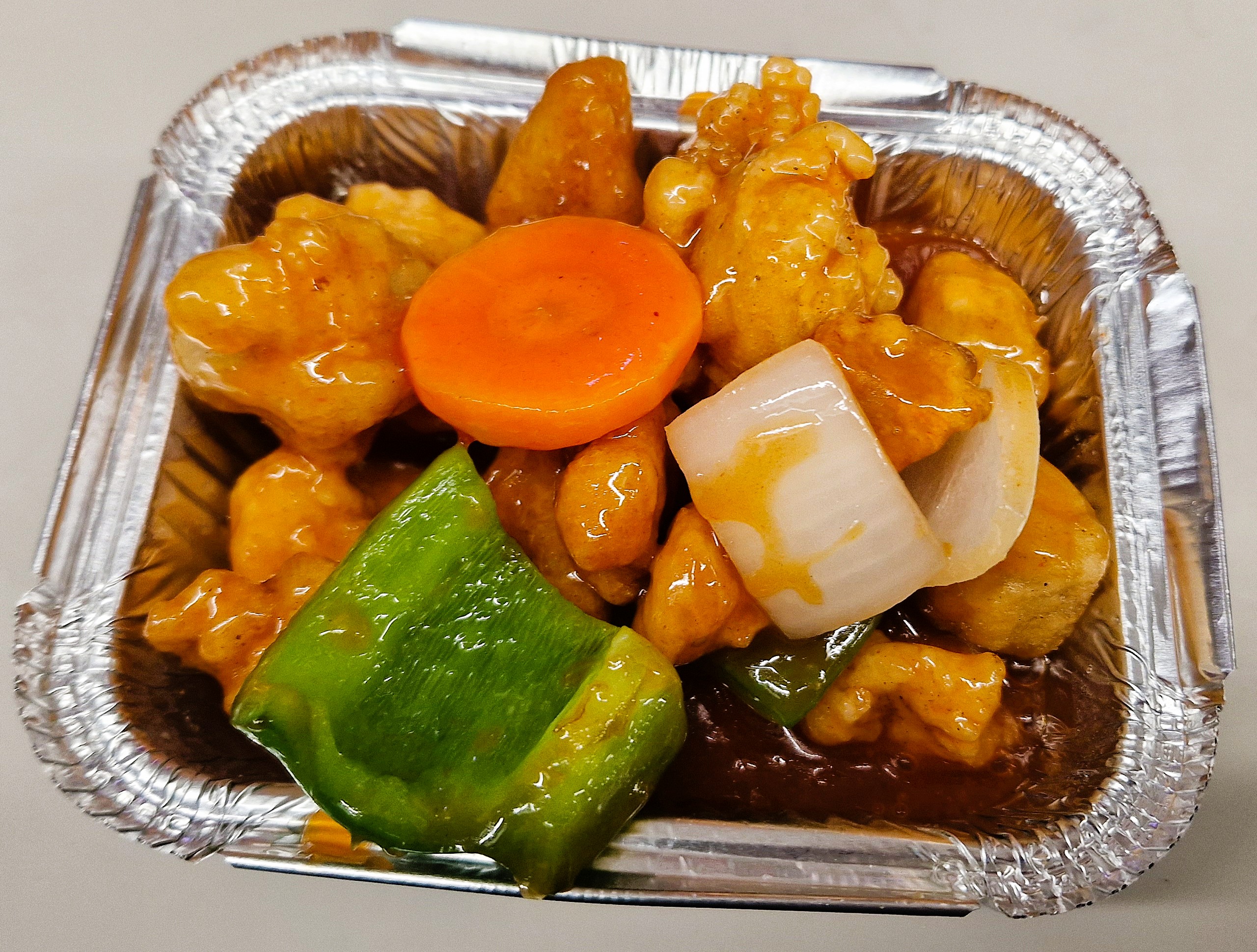Fried in a light corn flour batter, served in our sweet and sour sauce with onions, carrots, pineapple and green peppers