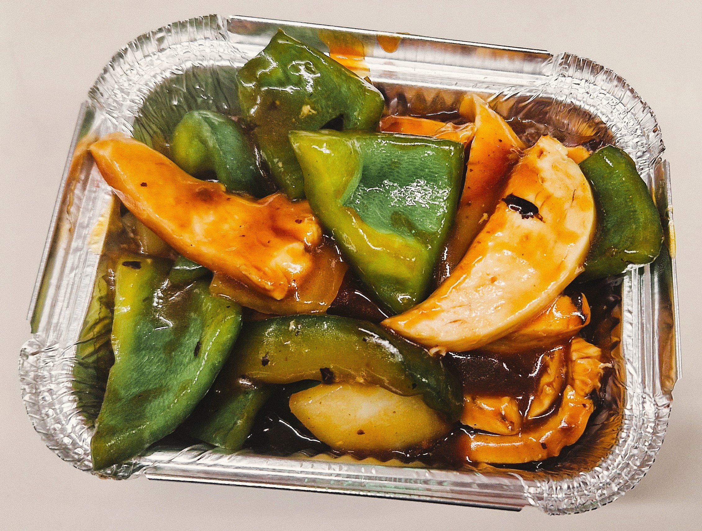 Stir fried chicken with onions and green peppers in our black bean infused oyster sauce with fresh chilli for a little kick.