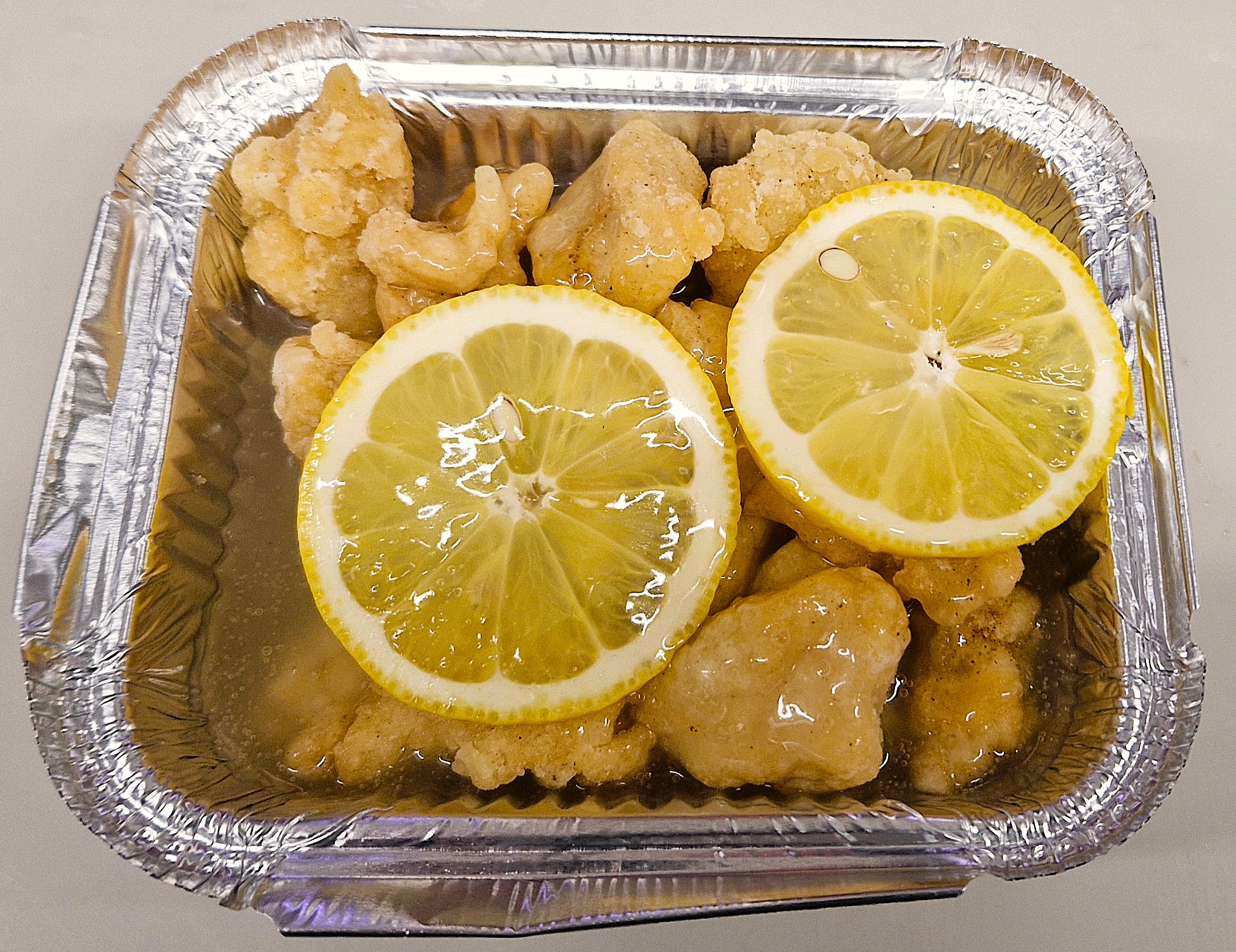 Chicken breast coated in a light cornflour batter and deep fried, served with two slices of lemon and our homemade lemon sauce.